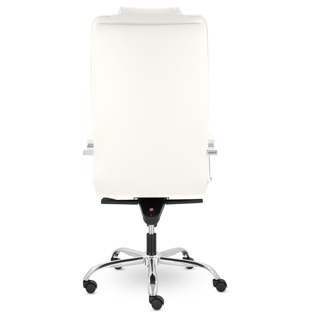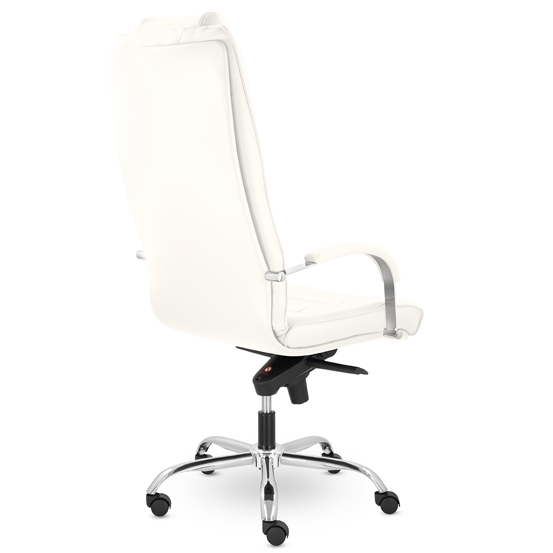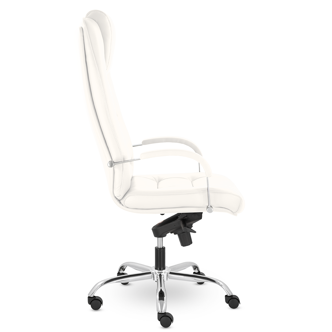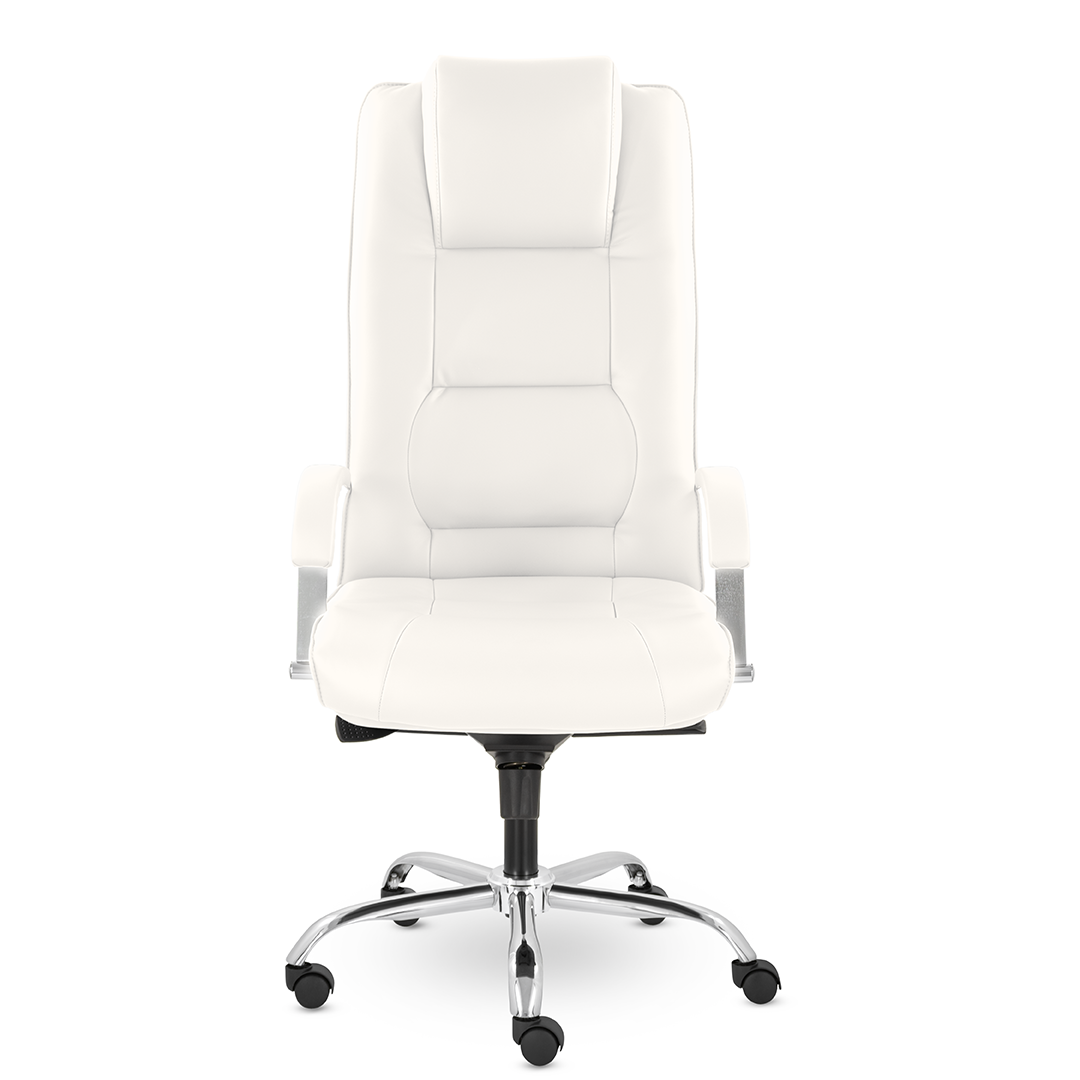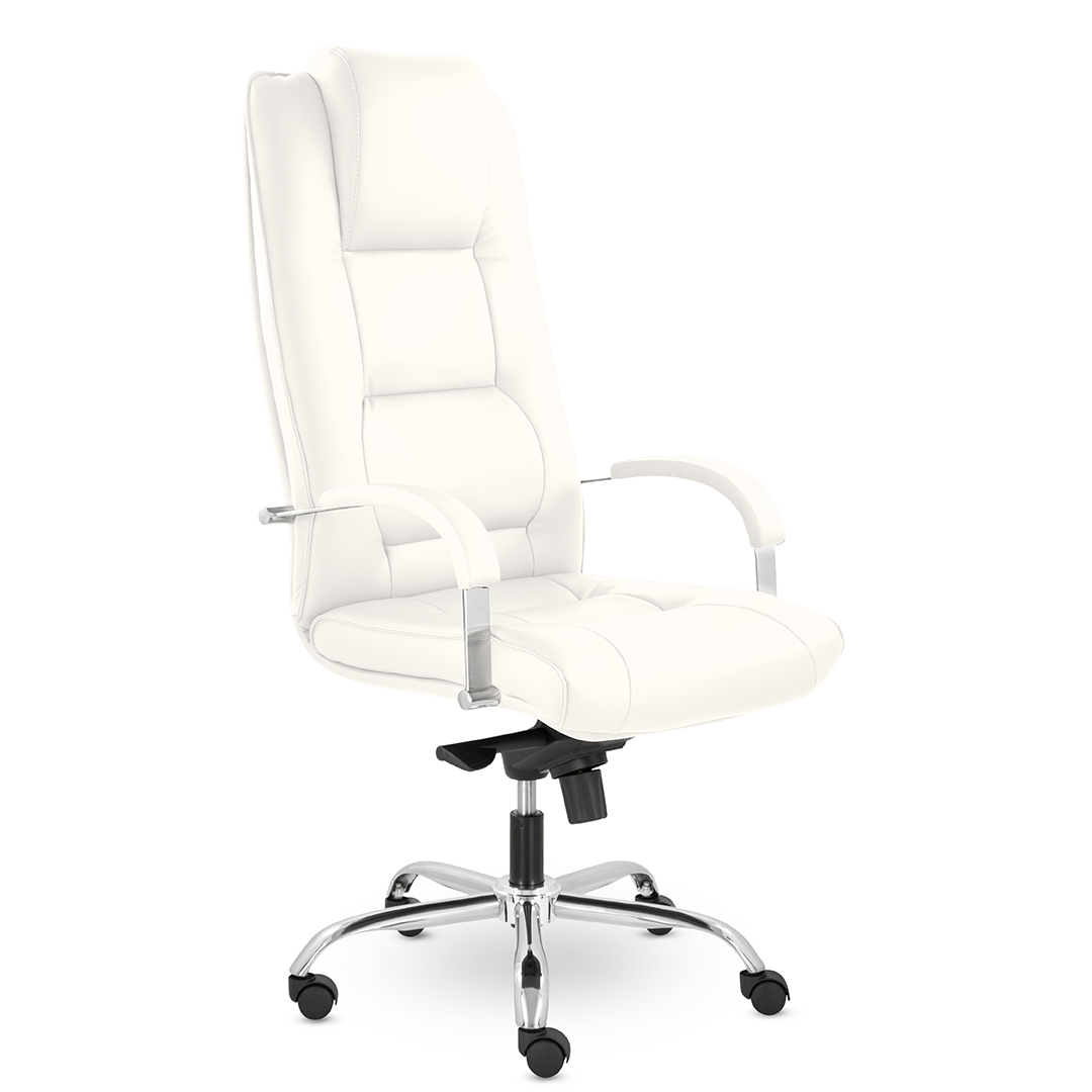 Грациозное кресло руководителя с ярко выраженным мягким подголовником. Спинка и сидение имеют горизонтальные прострочки, делящие их на квадраты. Хромированные подлокотники с мягкими накладками. Кресло стоит на хромированной крестовине, максимальная нагрузка которой 120 кг.