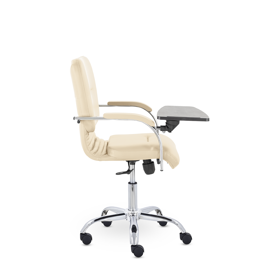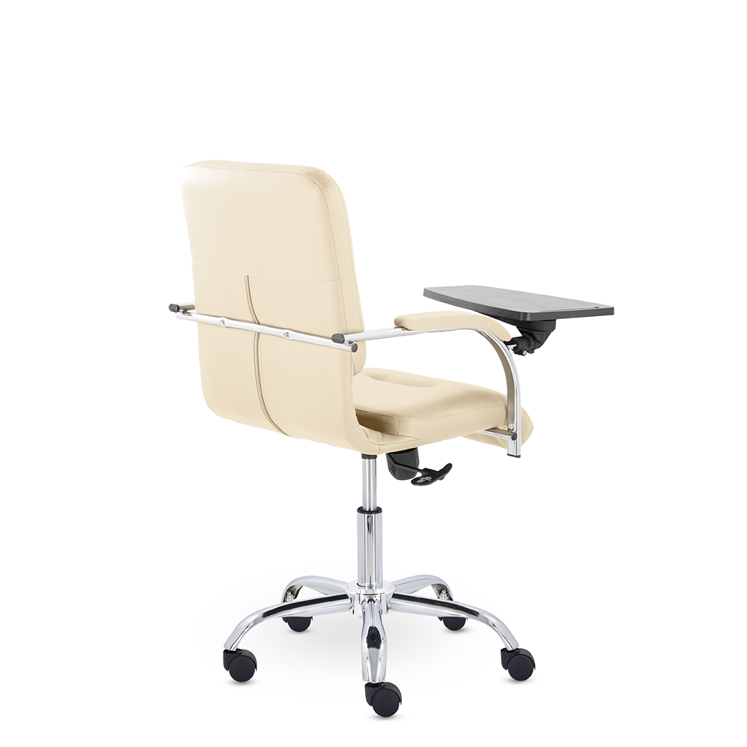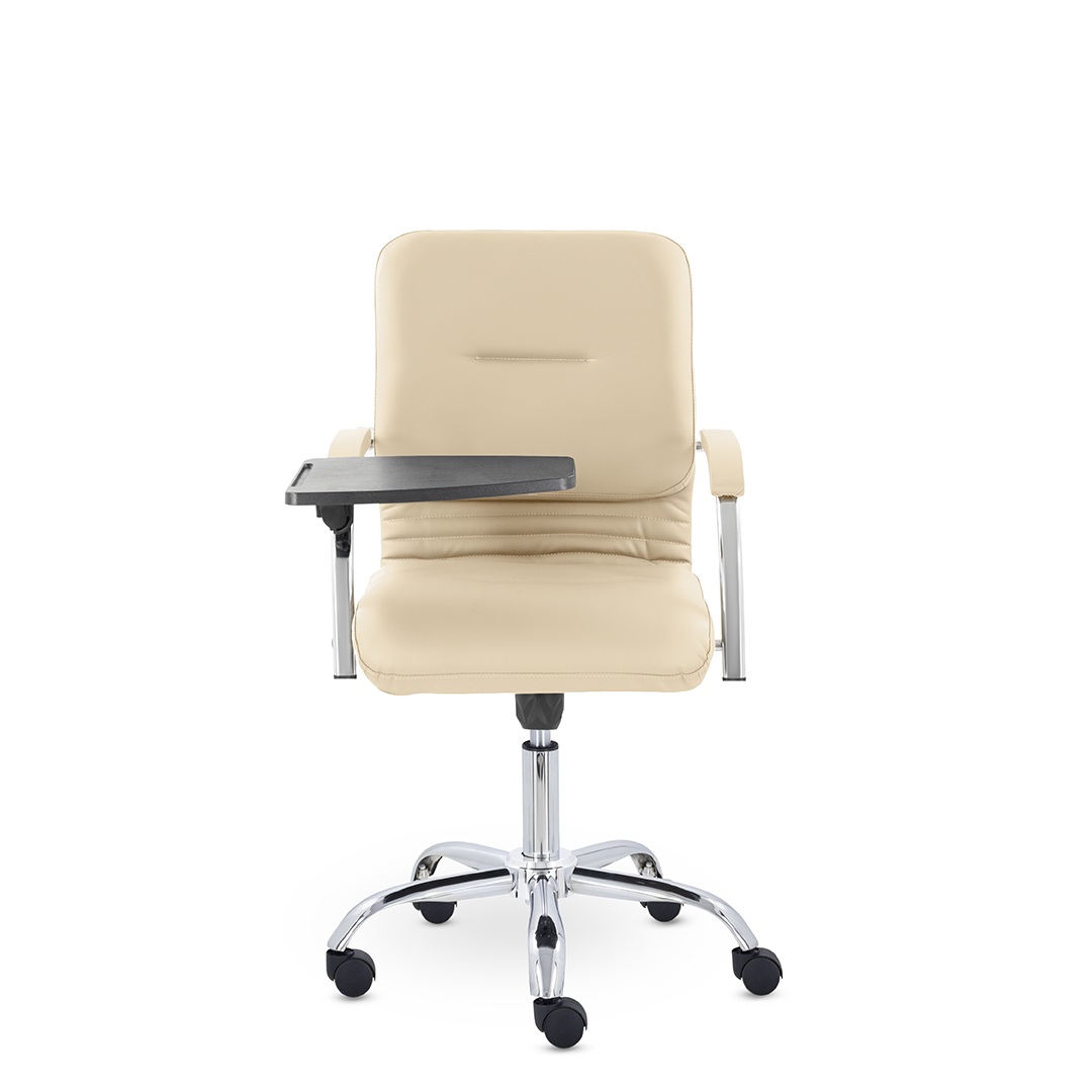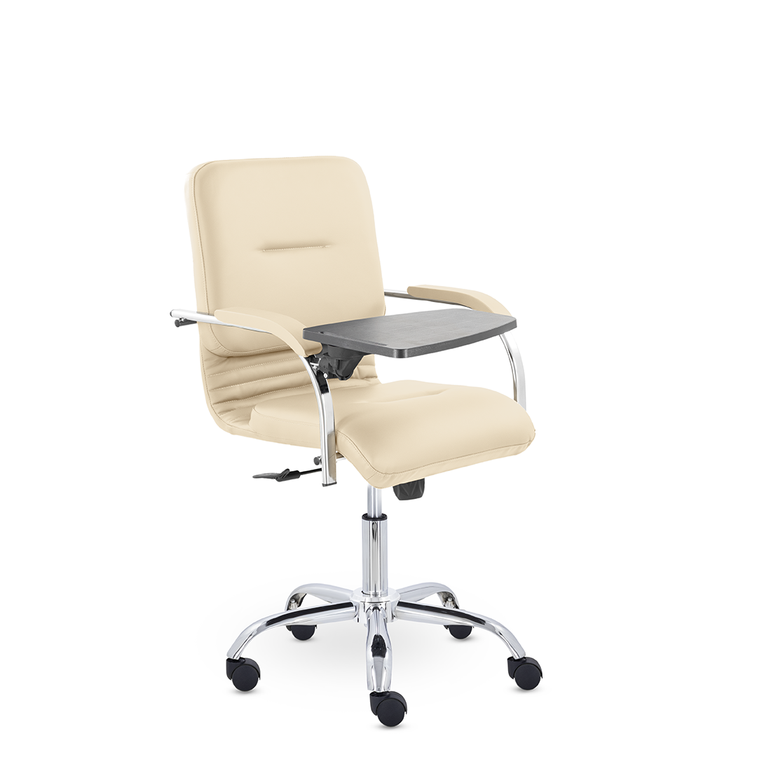 Улучшенная комплектация кресла включает горизонтальные прострочки, соединяющие спинку и сиденье, что придает креслу современный нео-классический стиль. Удобные накладки обеспечивают комфортную поддержку рук и способствуют их расслаблению. К креслу прилагается столик, выполненный из пластика. Модель отлично подойдет для конференц-залов, переговорных, актовых залов.