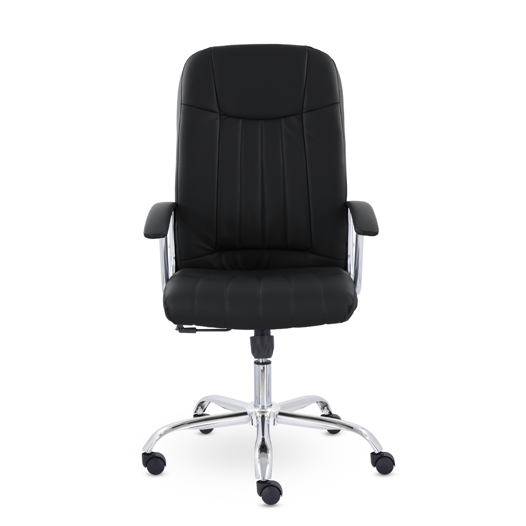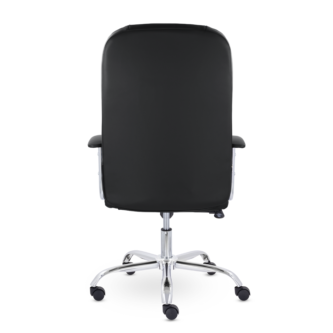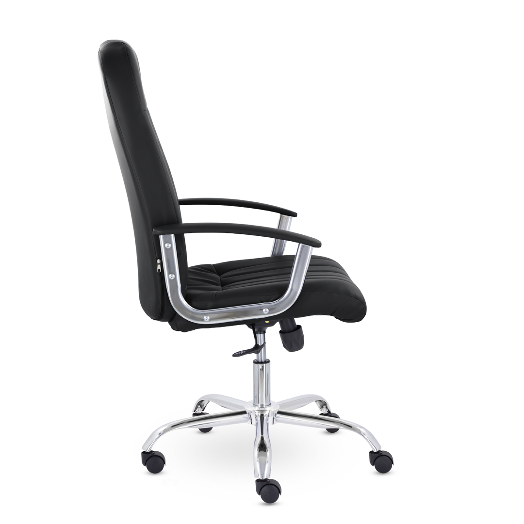 Кресло руководителя с мягкими увеличенными подушками. Широкая эргономичная спинка имеет две горизонтальные прострочки, которые отделяют подголовник от основной части спинки. Благодаря глубокому сиденью, в кресле будет удобно человеку среднего и высокого роста. Длинные хромированные подлокотники способствуют комфортной посадке в кресле.