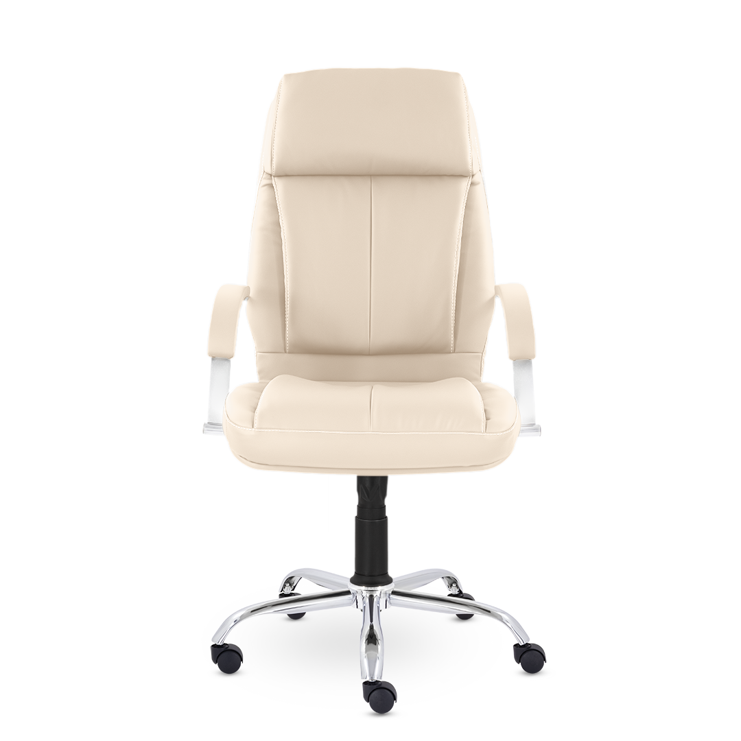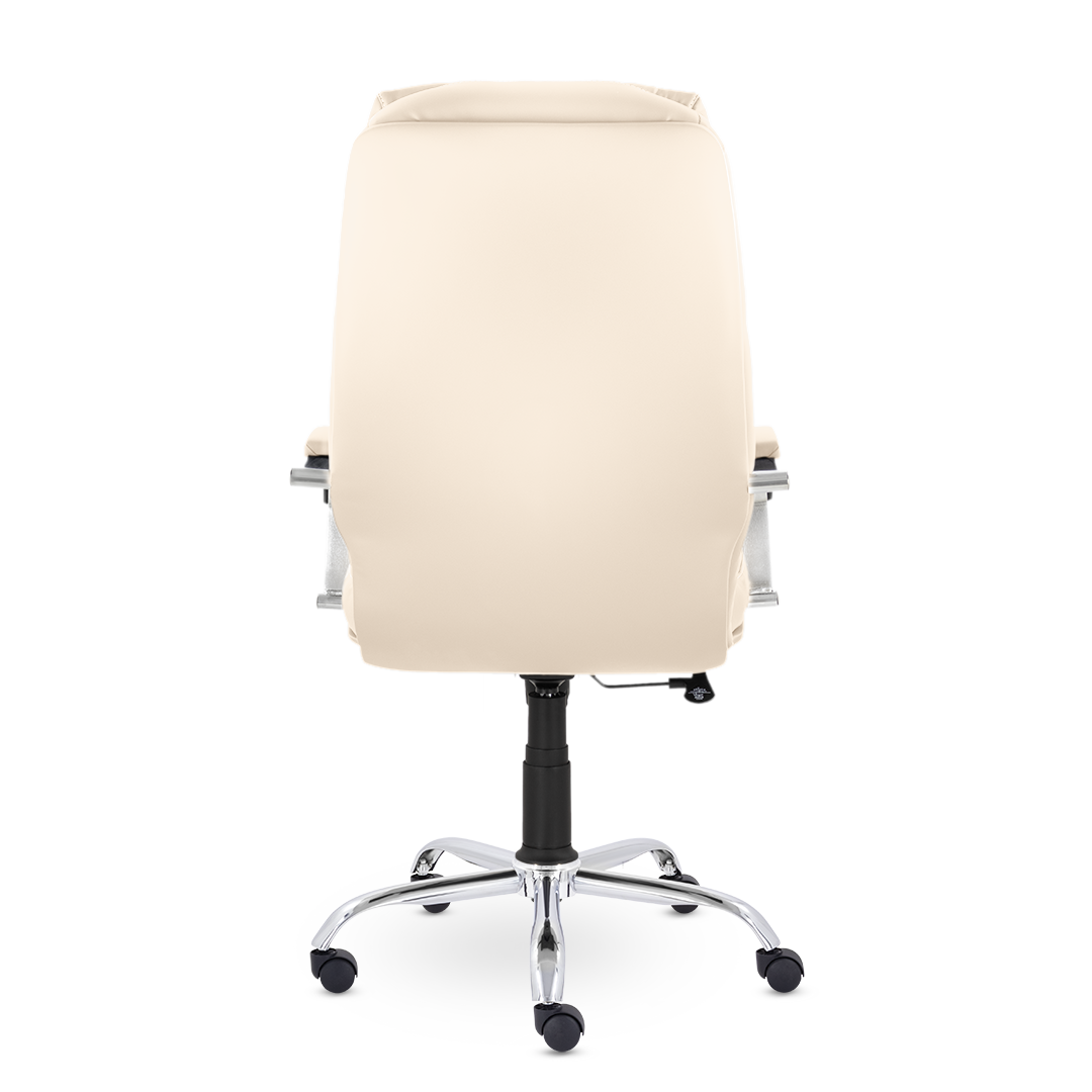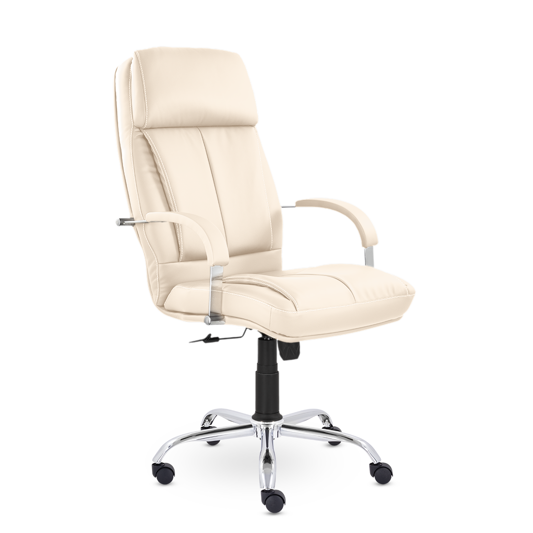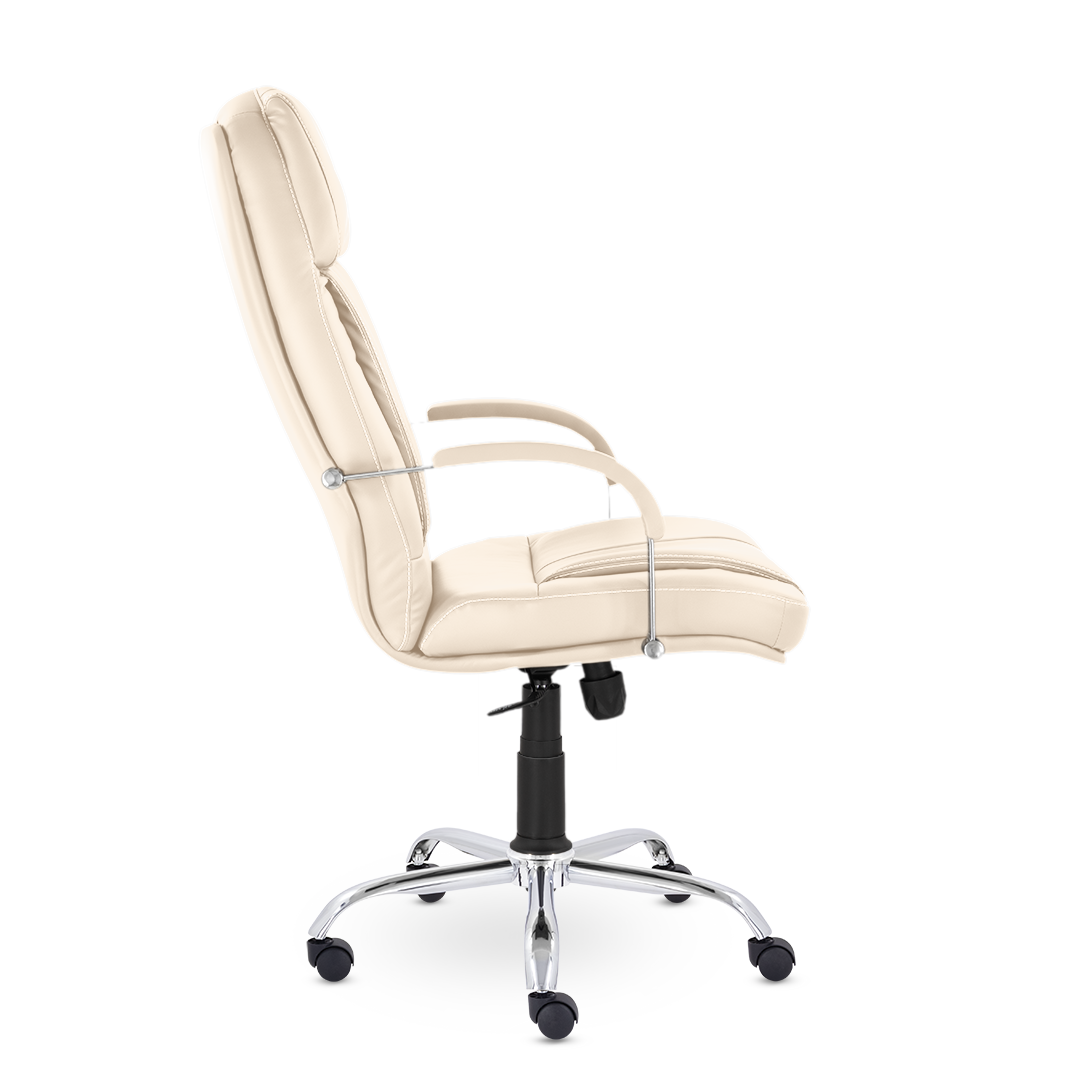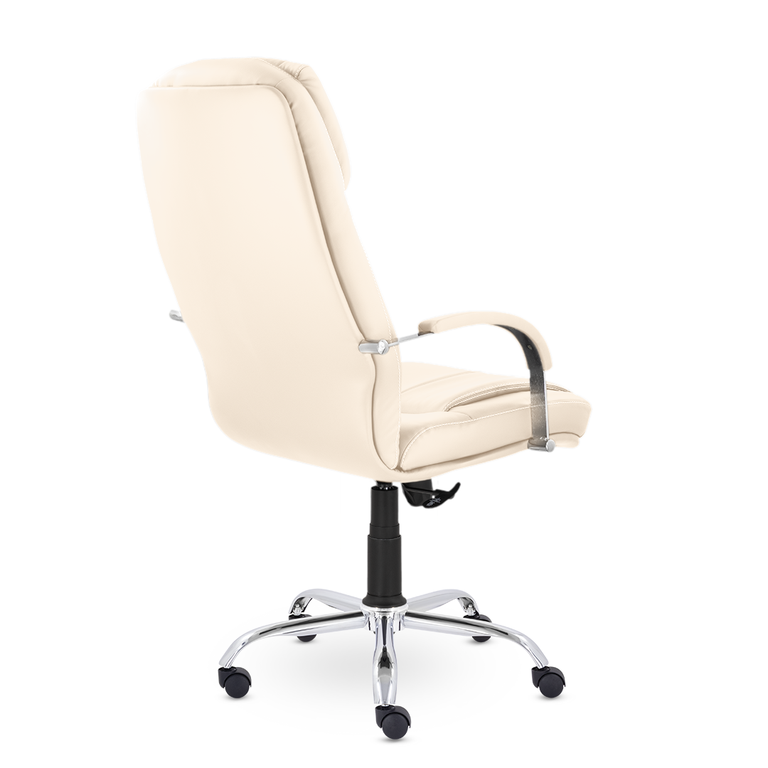 Кресло для настоящих ценителей комфорта! Широкая спинка оснащена увеличенными вертикальными подушками и объемным подголовником. Хромированные подлокотники с мягкими накладками. Солидное кресло отлично будет сочетаться с кабинетом с деревянными элементами в дизайне.