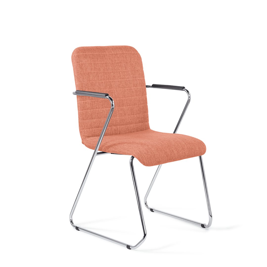 Уникальный каркас из металла и узкие подлокотники с небольшими накладками придают конструкции легкость и прочность. Горизонтальные строчки на спинке подчеркивают элегантный внешний вид. Хромированный каркас выдерживает до 120 кг.