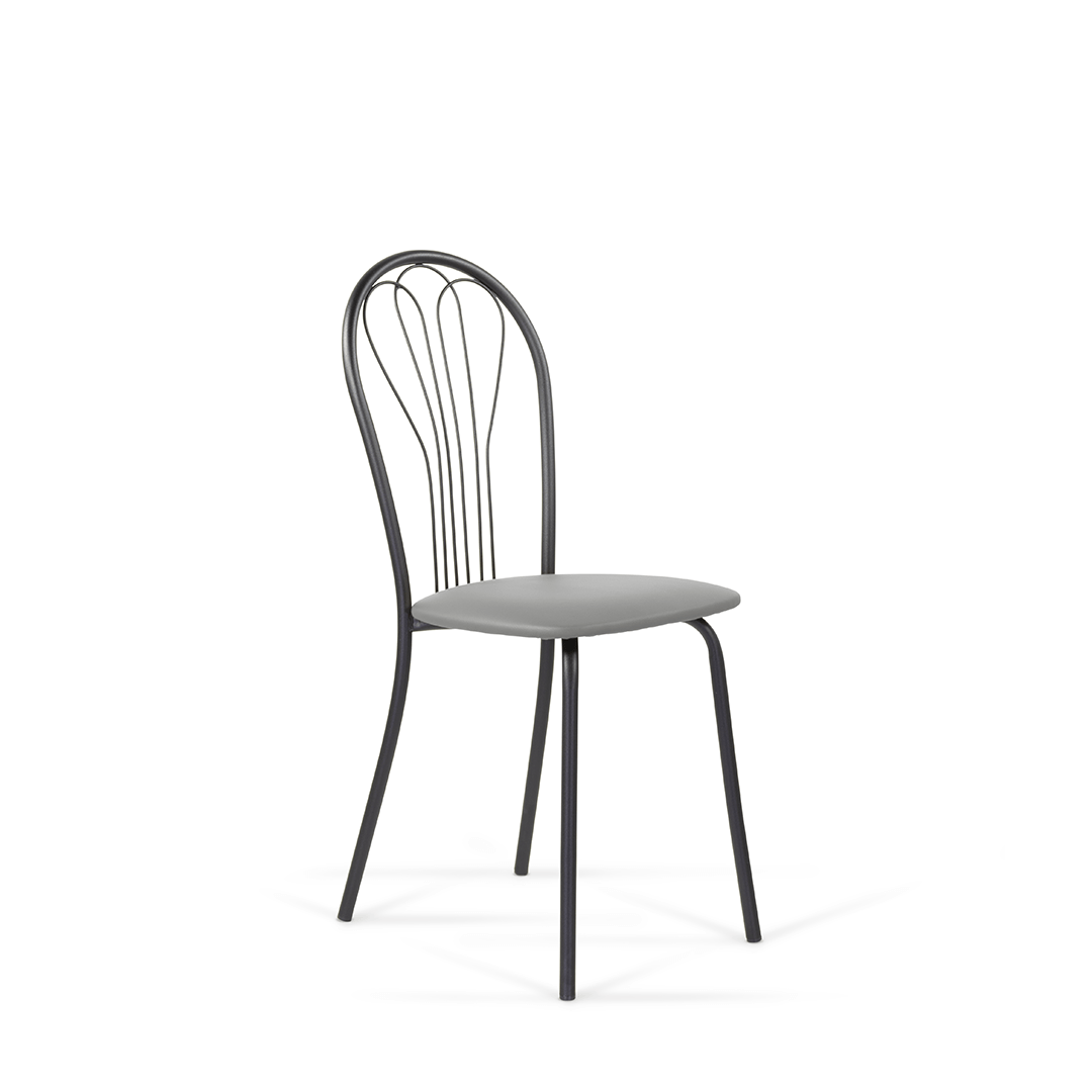 Небольшой стул с округлой спинкой и мягким сиденьем может выступать как часть обеденной зоны, а может быть самостоятельной деталью в интерьере. Каркас стула выполнен из металла.