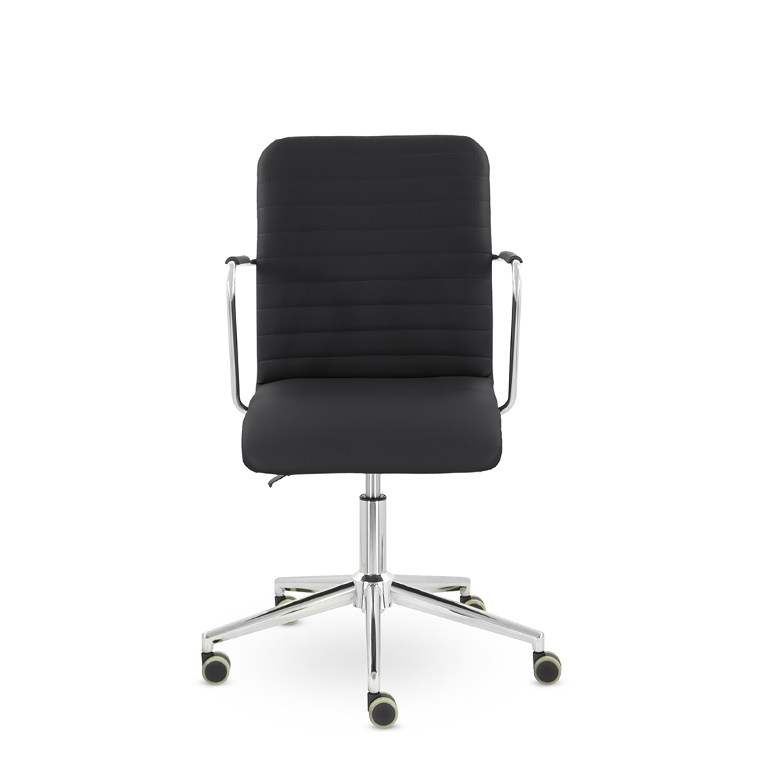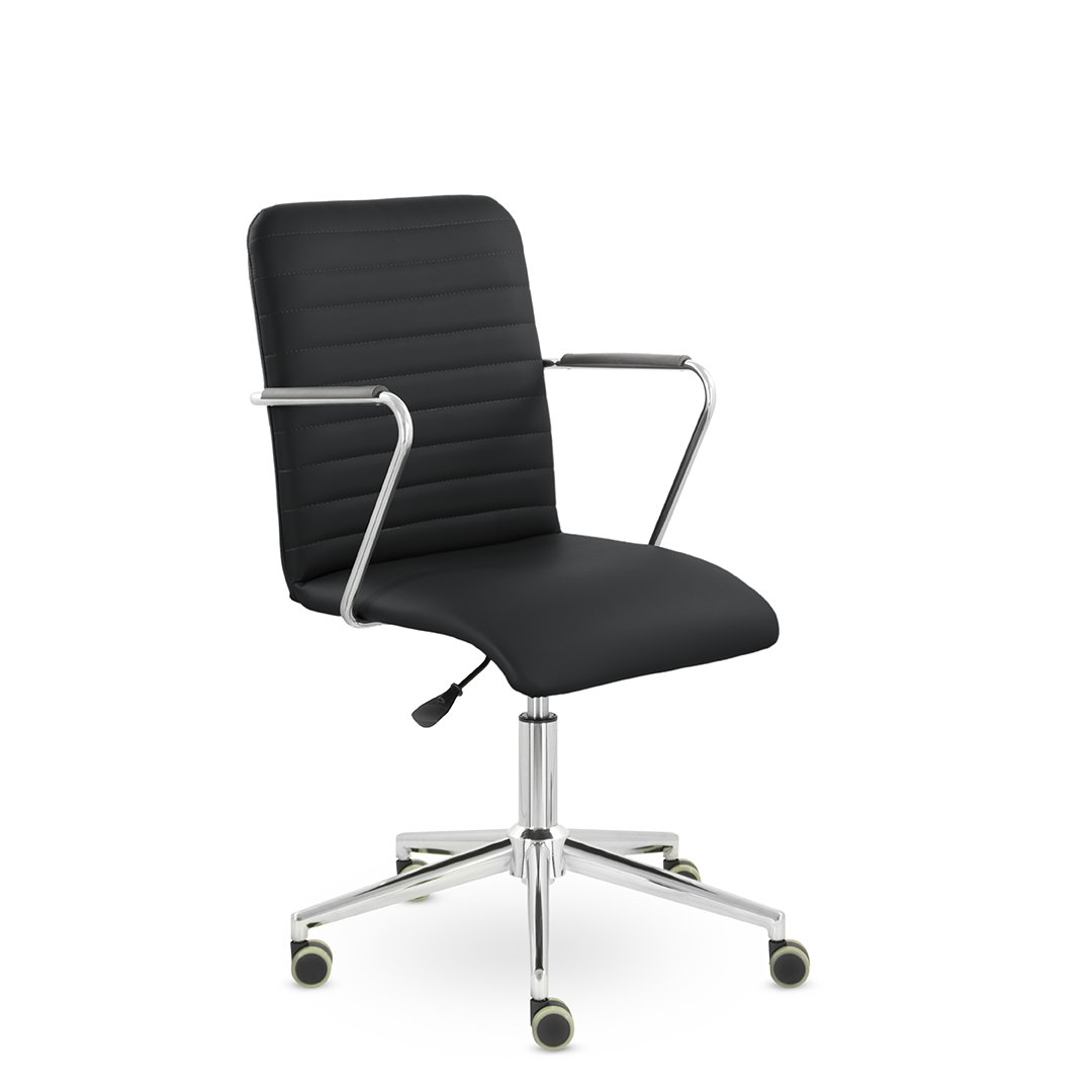 Уникальный каркас из металла и узкие хромированные подлокотники с небольшими пластиковыми накладками придают конструкции легкость и прочность. Горизонтальные строчки на спинке подчеркивают элегантный и современный вид.