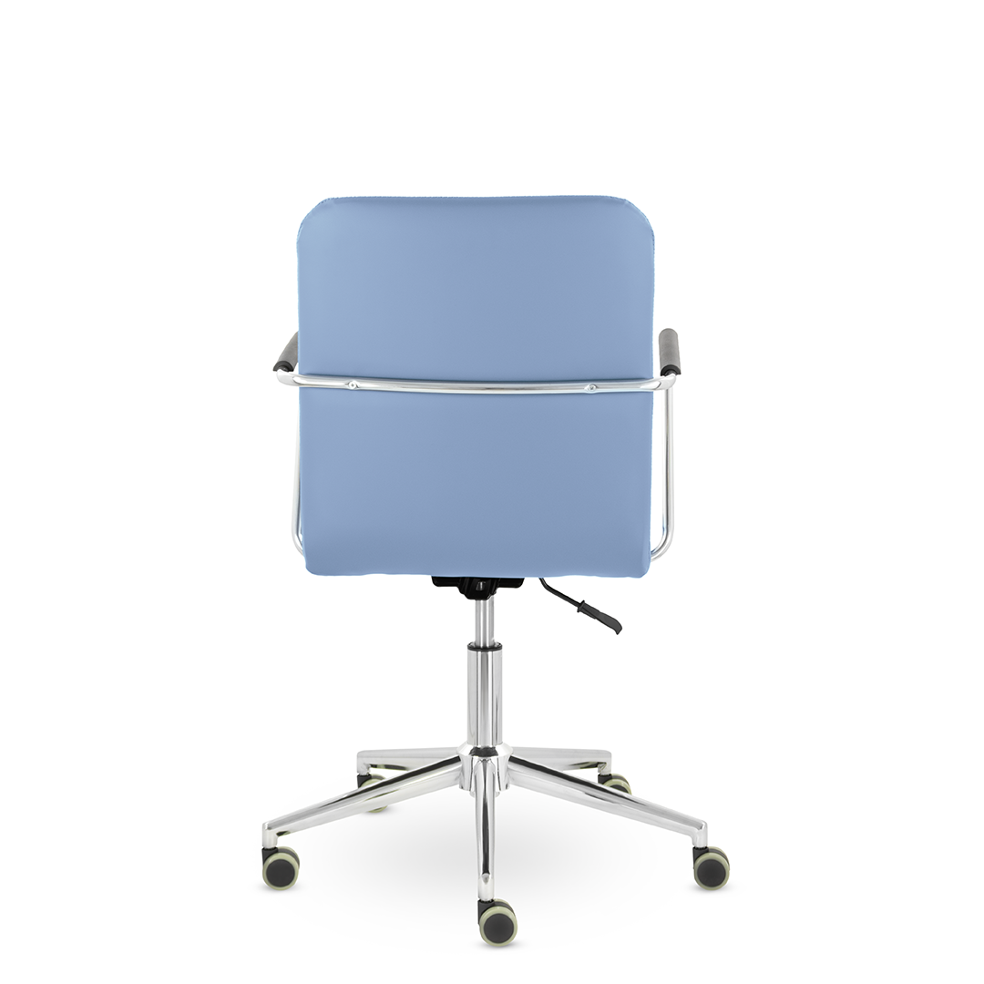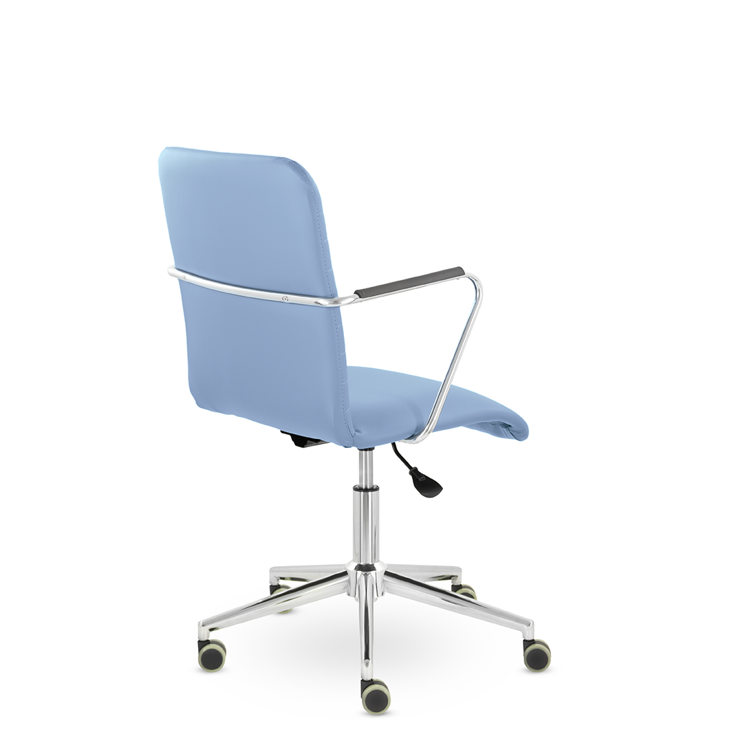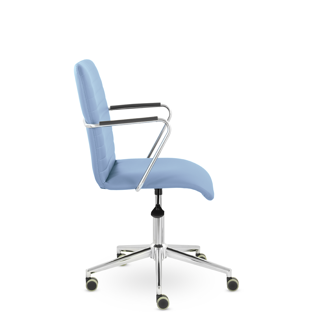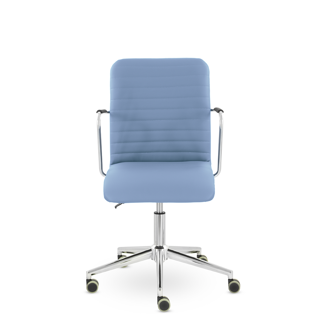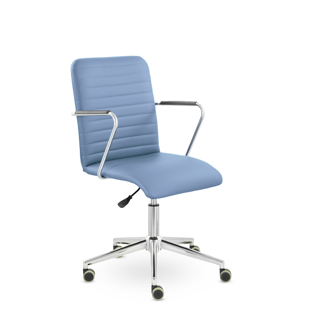 Уникальный каркас из металла и узкие хромированные подлокотники с небольшими пластиковыми накладками придают конструкции легкость и прочность. Горизонтальные строчки на спинке подчеркивают элегантный и современный вид.