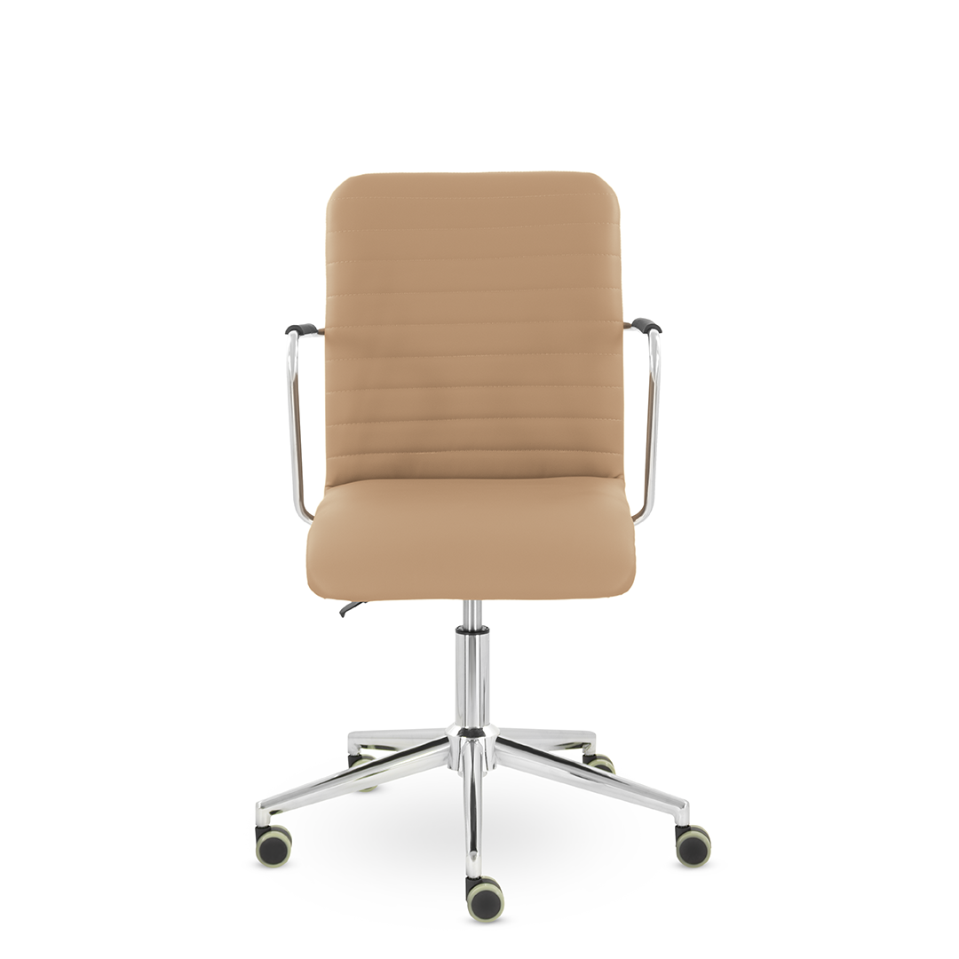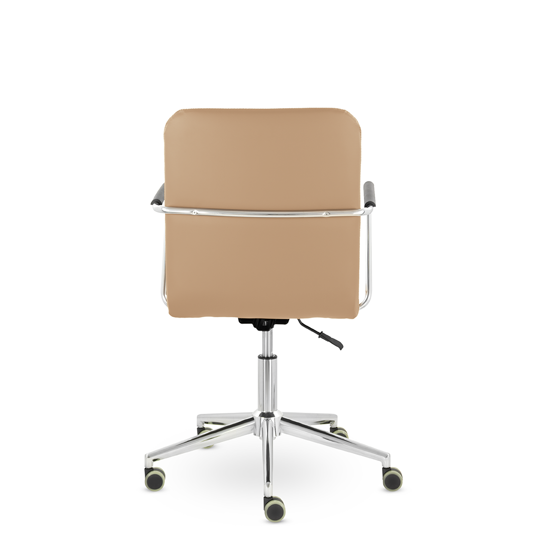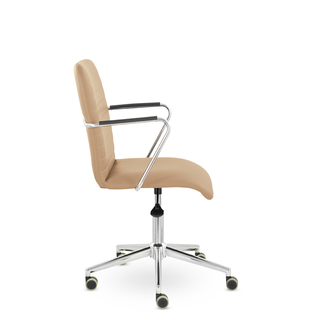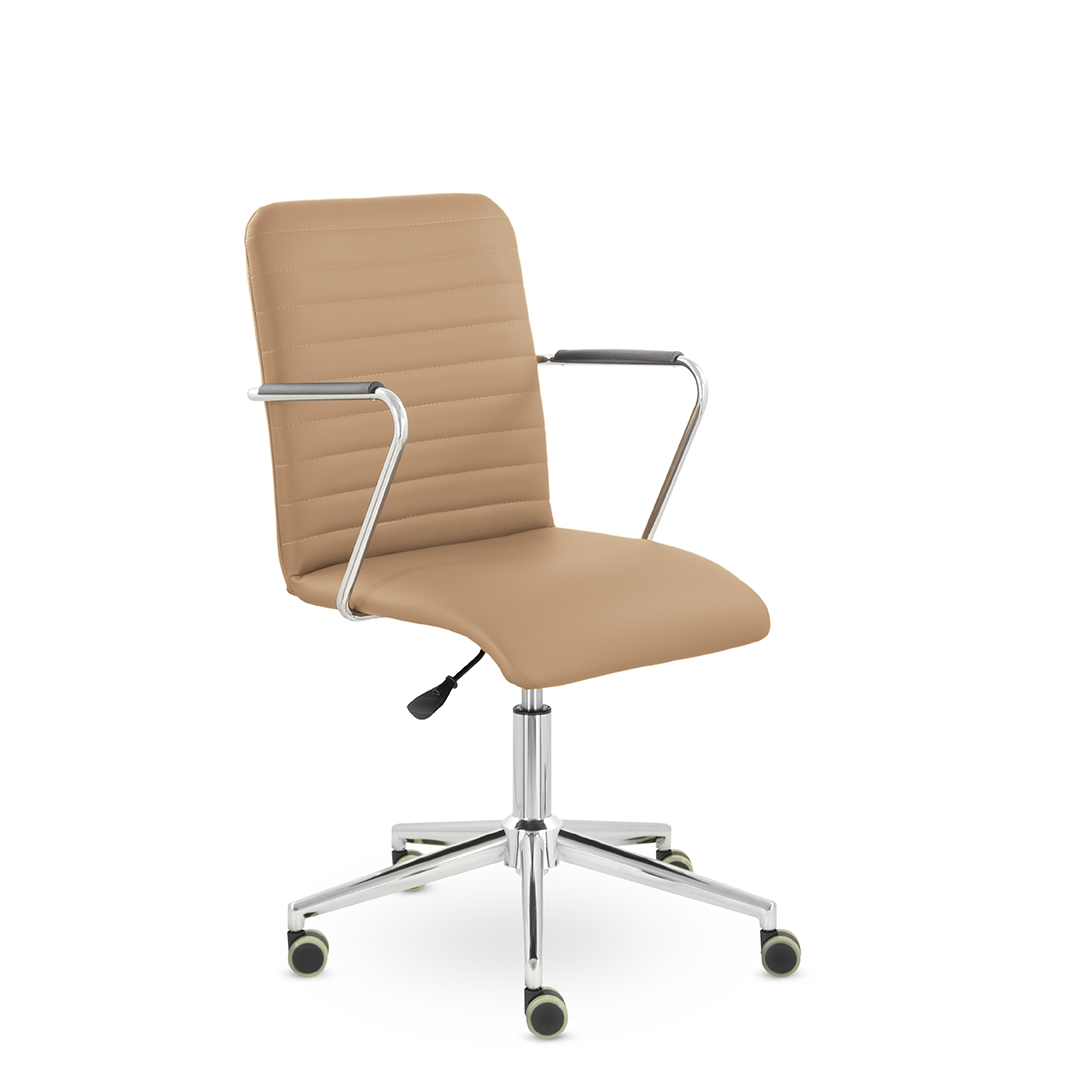 Уникальный каркас из металла и узкие хромированные подлокотники с небольшими пластиковыми накладками придают конструкции легкость и прочность. Горизонтальные строчки на спинке подчеркивают элегантный и современный вид.
