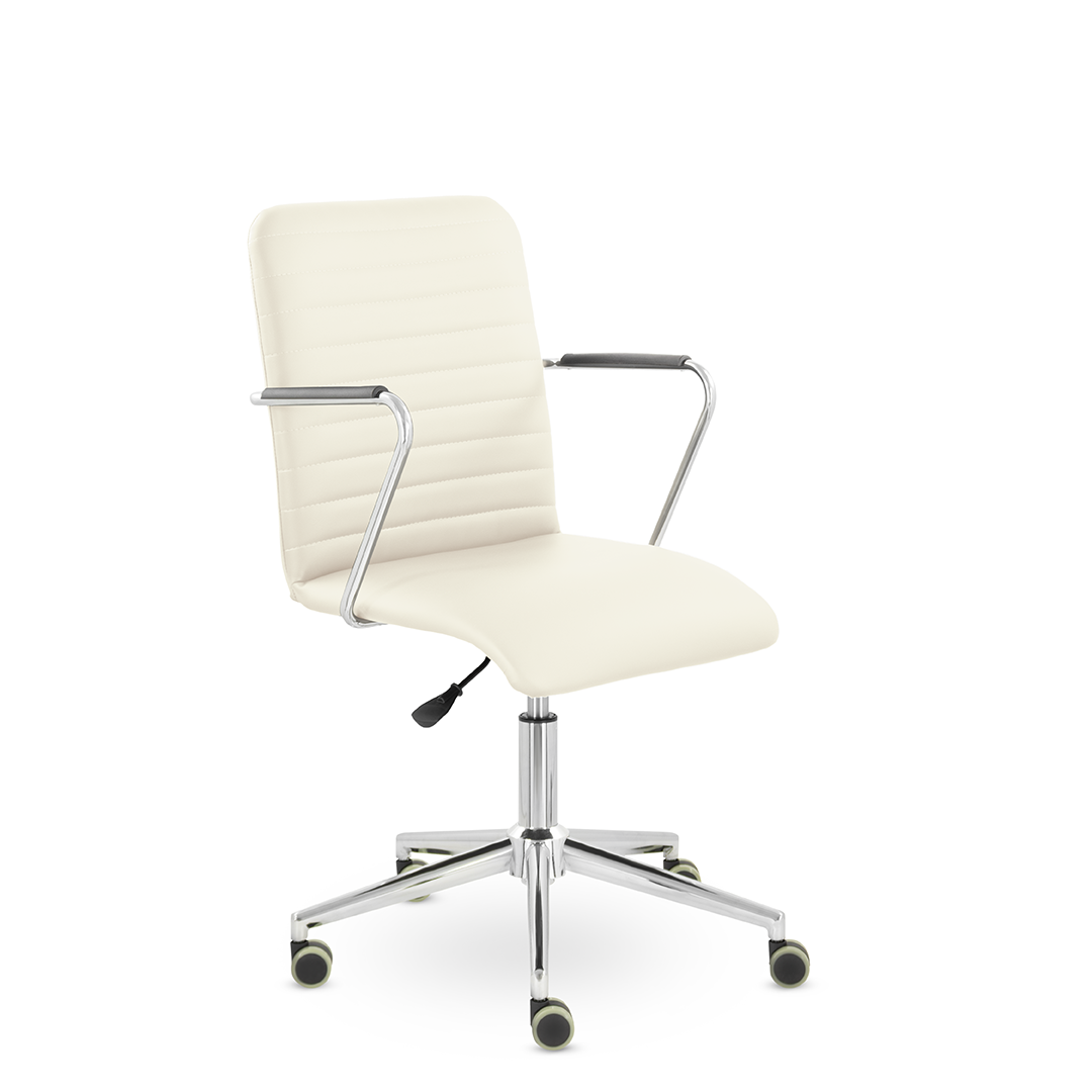 Уникальный каркас из металла и узкие хромированные подлокотники с небольшими пластиковыми накладками придают конструкции легкость и прочность. Горизонтальные строчки на спинке подчеркивают элегантный и современный вид.