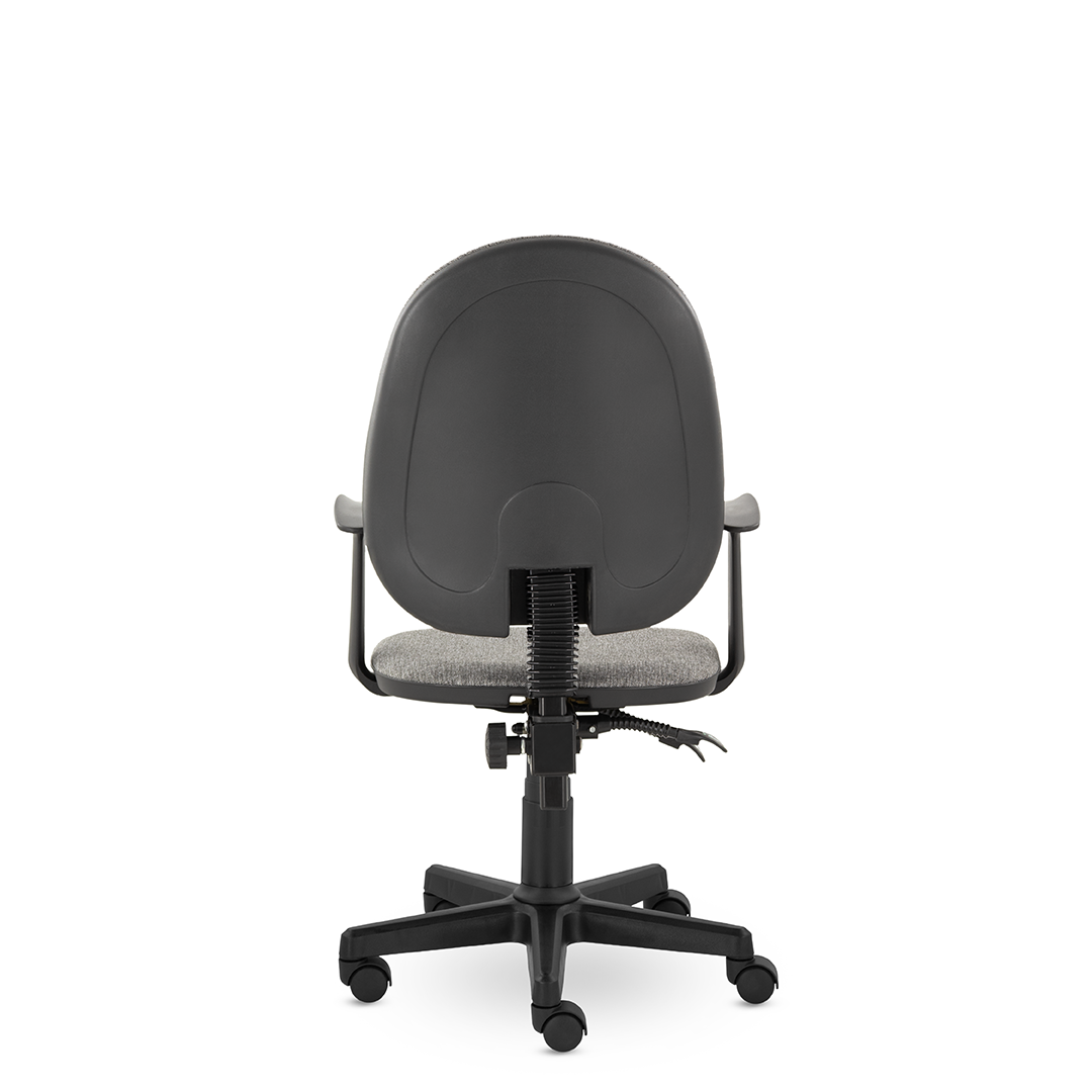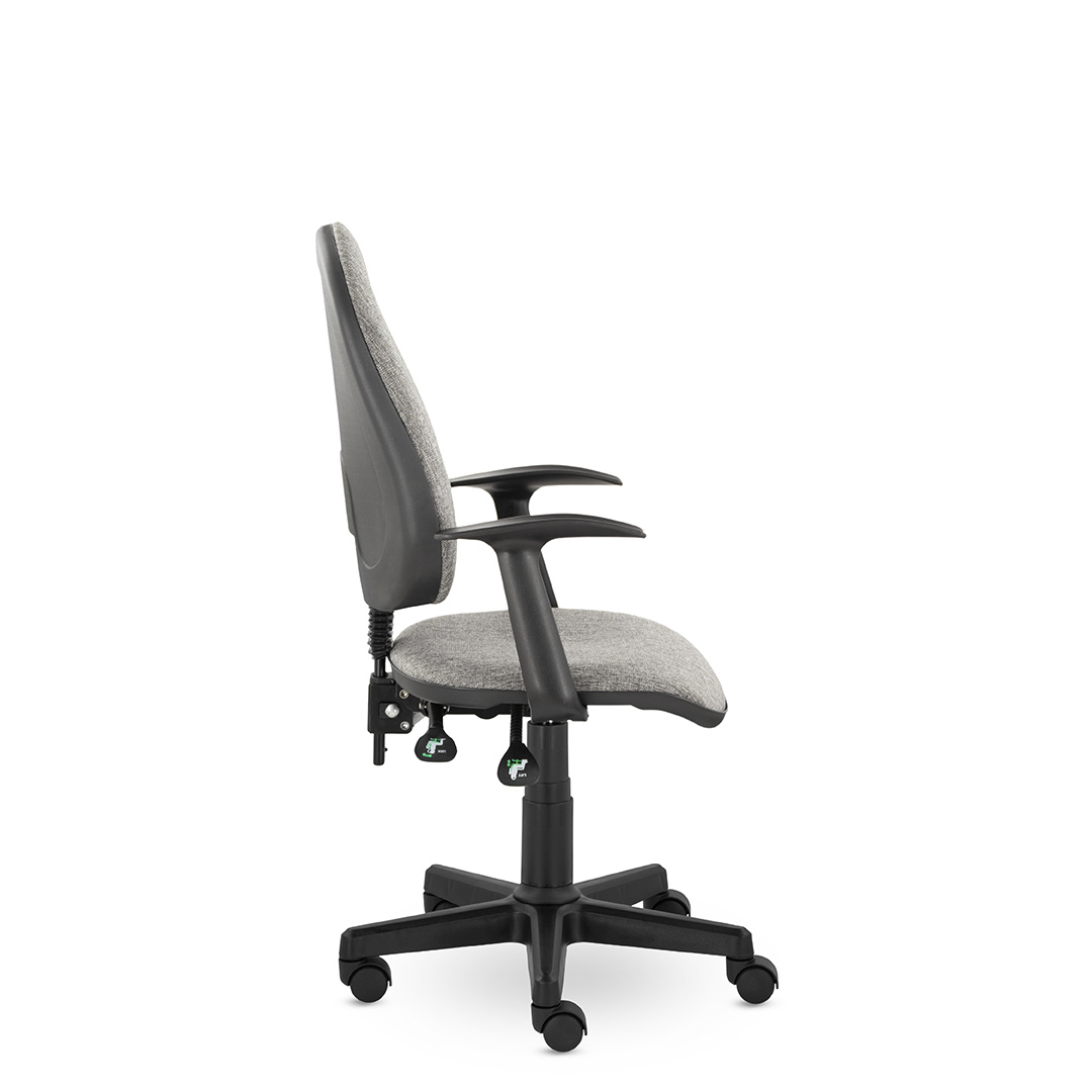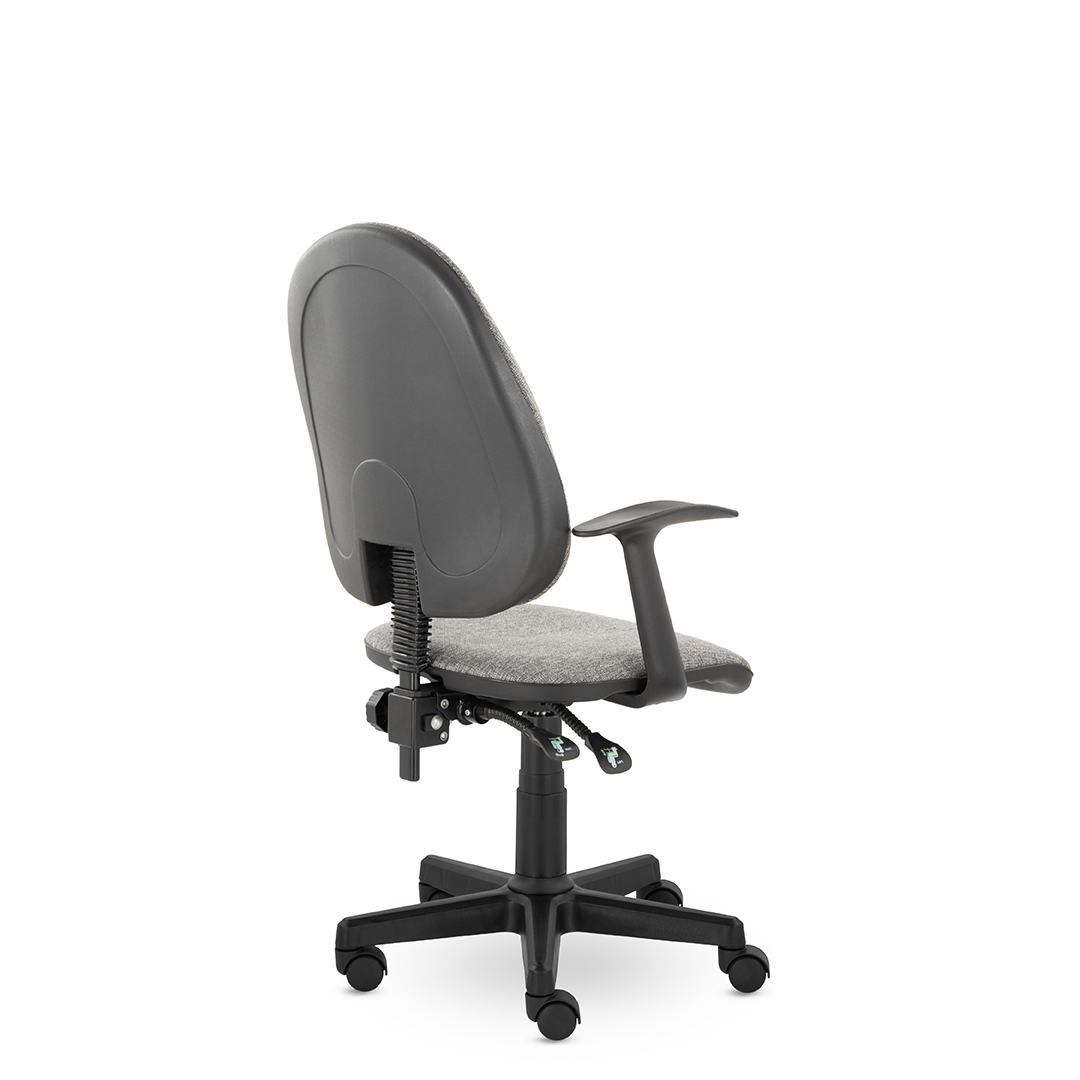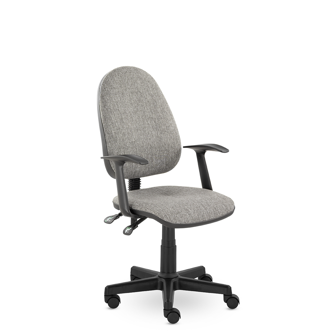 Комфортное кресло оператора имеет увеличенные мягкие подушки на спинке и сиденье, обитые износостойкой тканью. Удобные пластиковые подлокотники Т-образные подлокотники и синхромеханизм "Люкс" с 2-мя рычагами. Один рычаг для регулировки высоты подъема стула, второй рычаг позволяет свободно менять положение тела, обеспечивая постоянный контакт спины пользователя со спинкой кресла, а также фиксирует угол наклона спинки в любом положении.