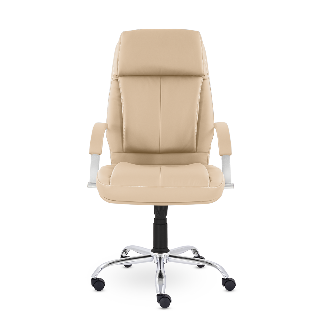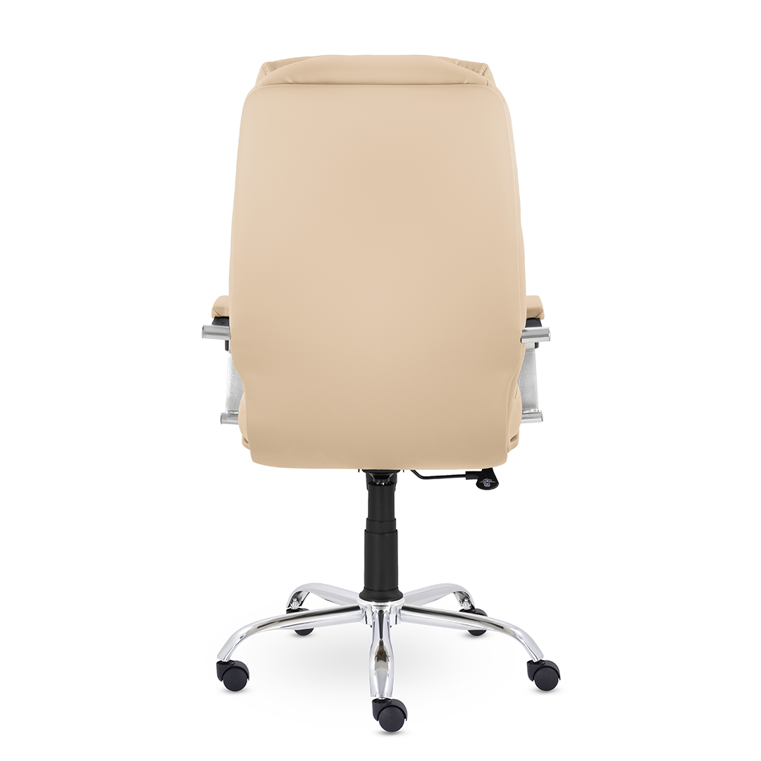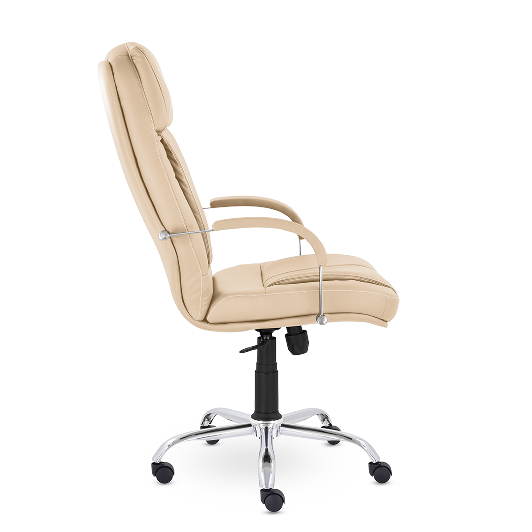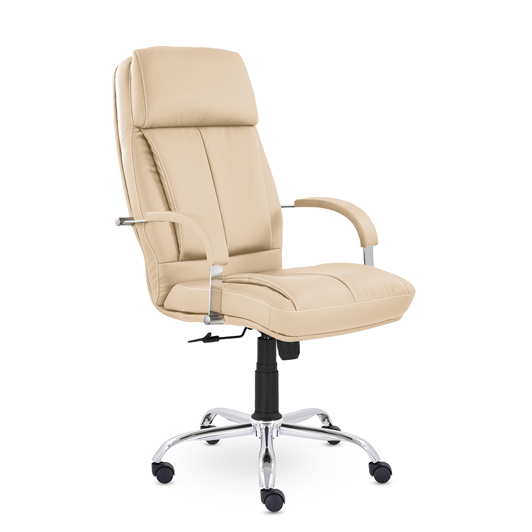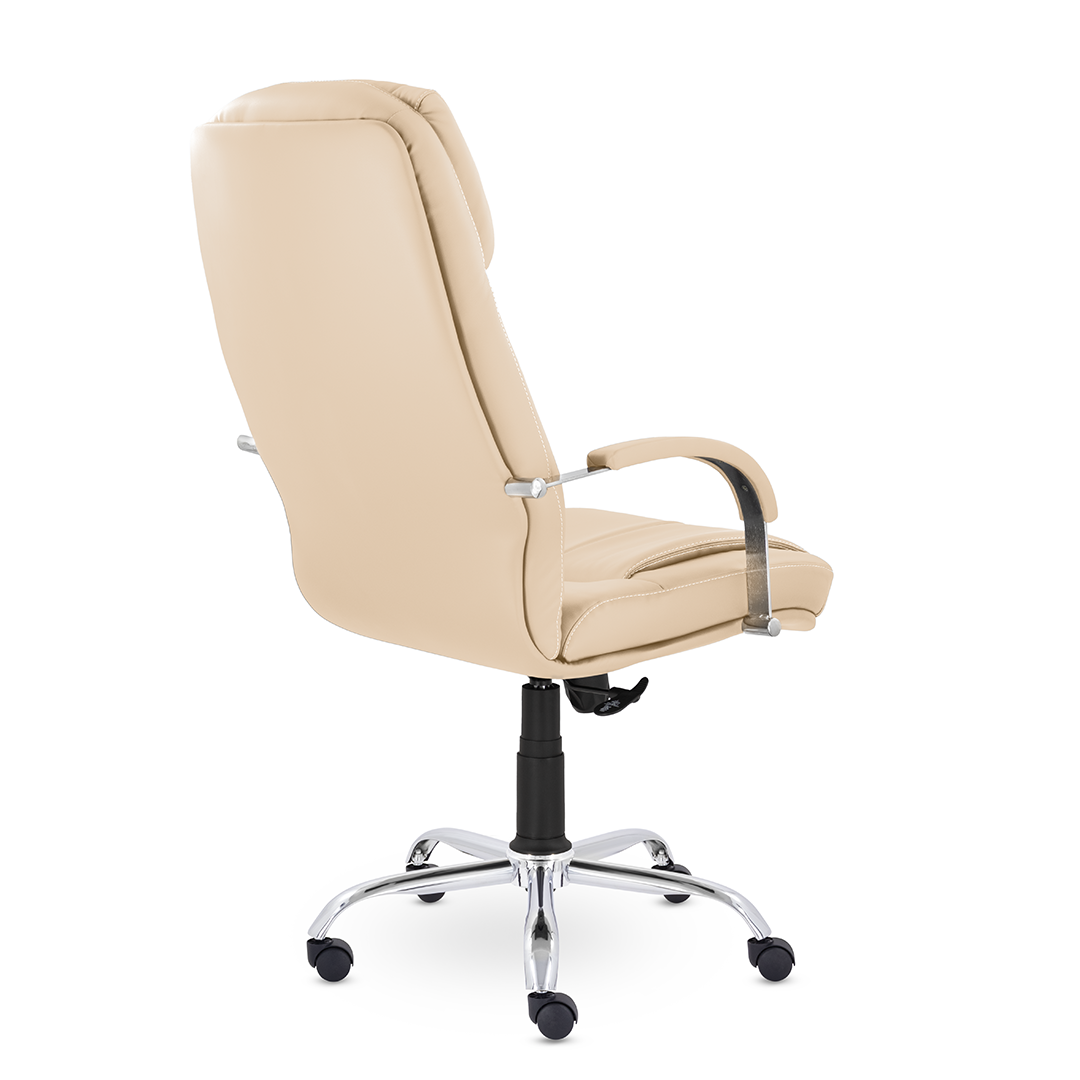 Кресло для настоящих ценителей комфорта! Широкая спинка оснащена увеличенными вертикальными подушками и объемным подголовником. Хромированные подлокотники с мягкими накладками. Солидное кресло отлично будет сочетаться с кабинетом с деревянными элементами в дизайне.
