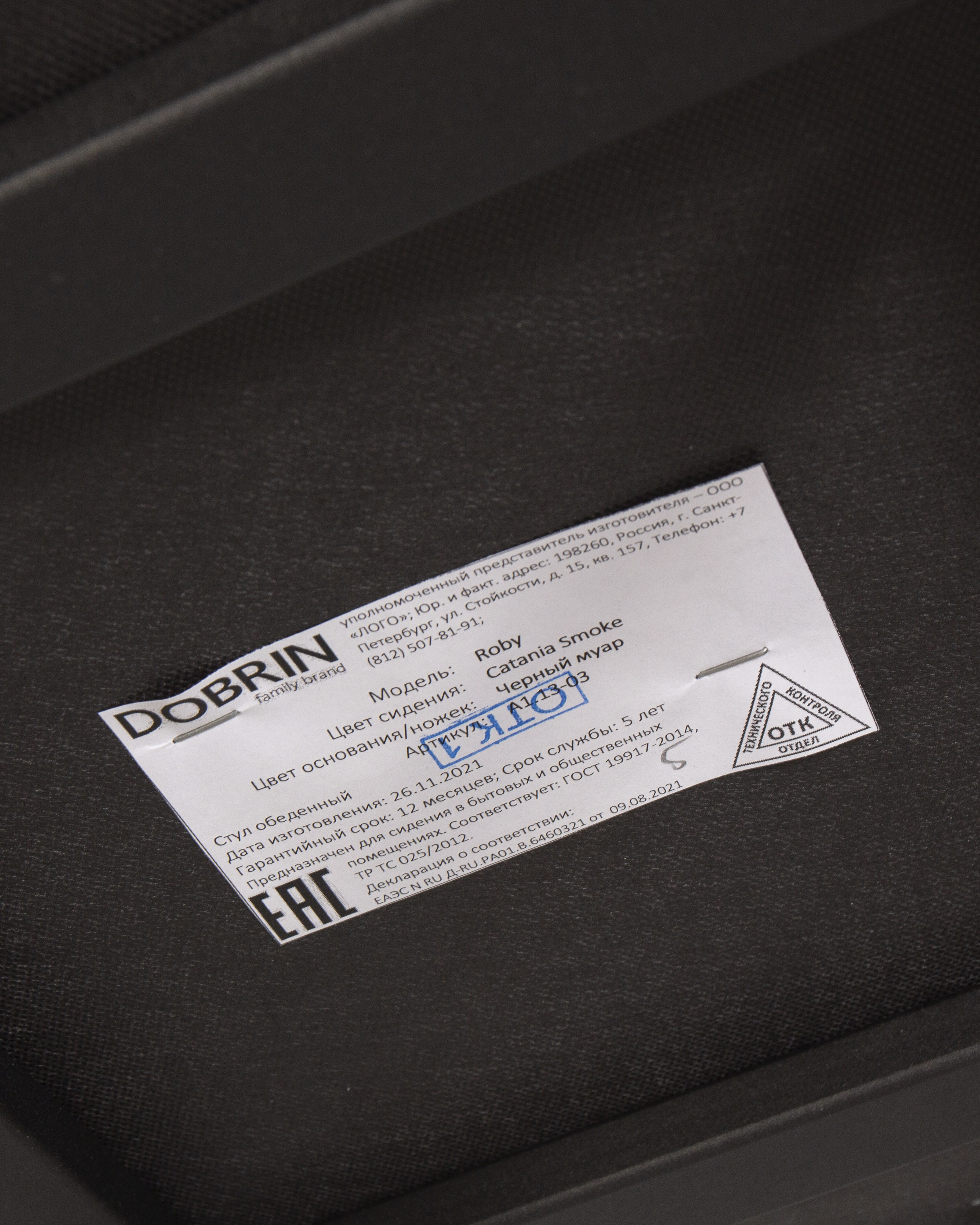 Стул обеденный DOBRIN ROBY, ЭМАЛЬ ЧЕРНЫЙ МУАР велюр Catania Smoke