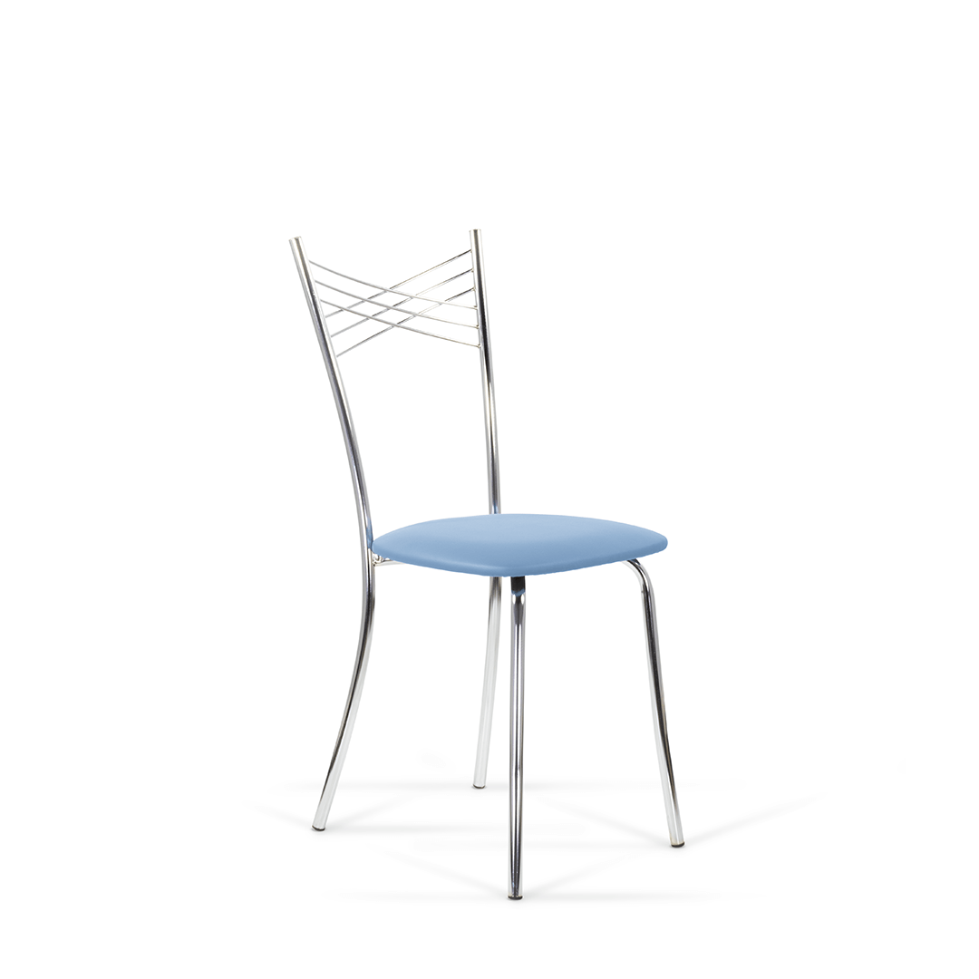Воздушная модель стула имеет интересный дизайн спинки, представляющую собой крестообразное пресечение нескольких металлических нитей, образующих в центре маленькие ромбики. Каркас стула выполнен из хромированного металла