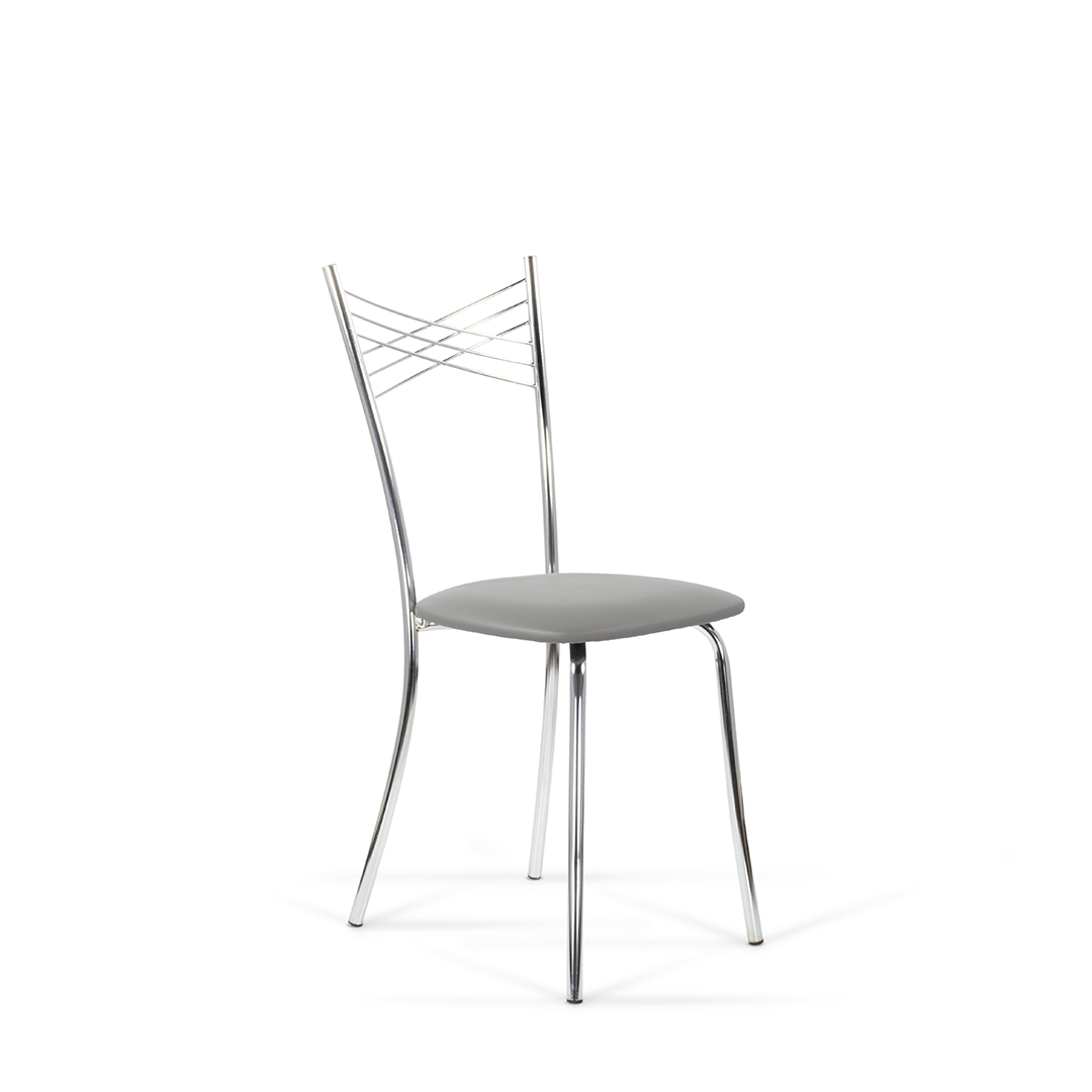Воздушная модель стула имеет интересный дизайн спинки, представляющую собой крестообразное пресечение нескольких металлических нитей, образующих в центре маленькие ромбики. Каркас стула выполнен из хромированного металла