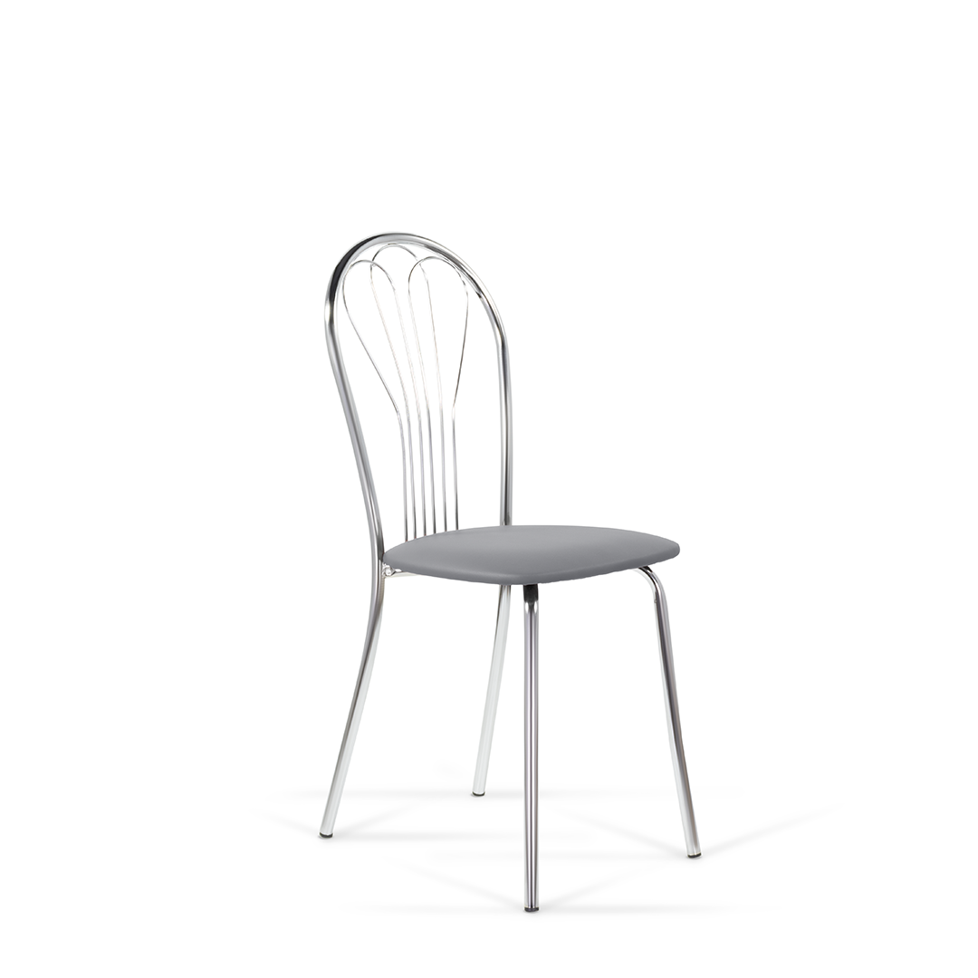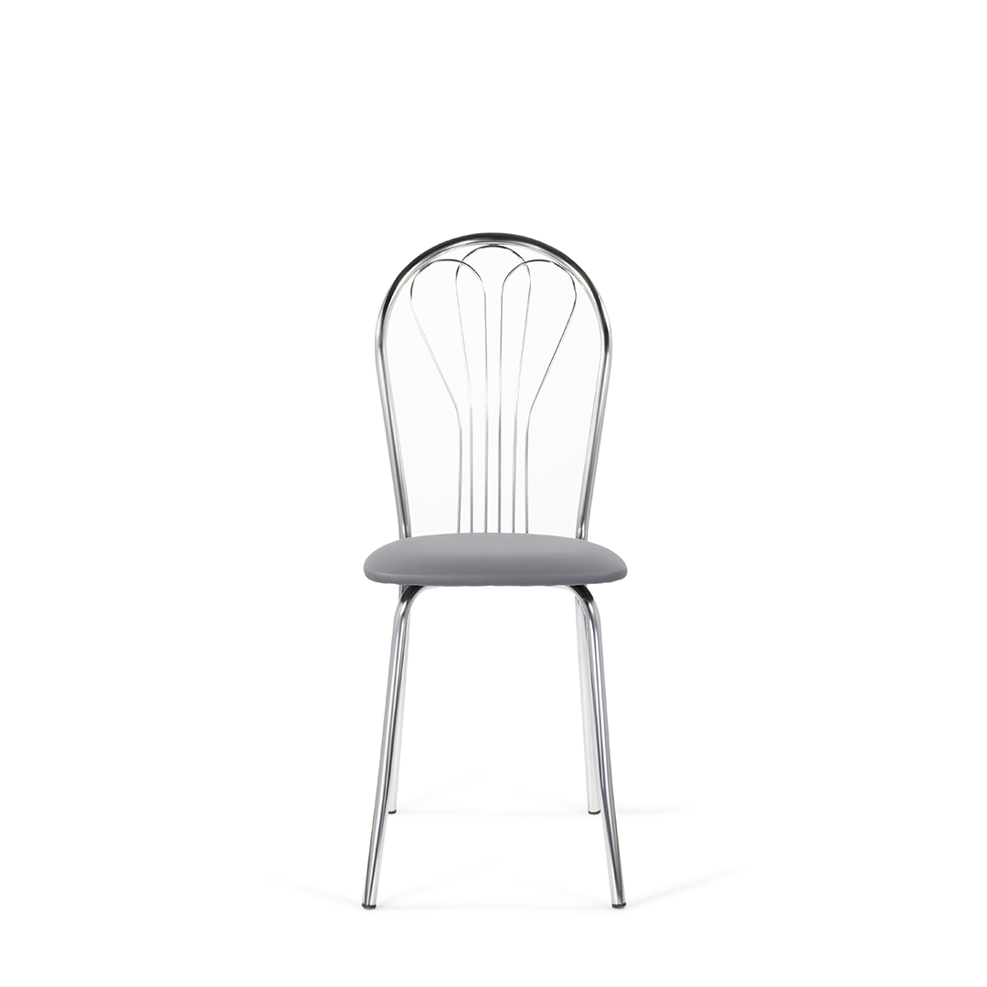 Небольшой стул с округлой спинкой и мягким сиденьем может выступать как часть обеденной зоны, а может быть самостоятельной деталью в интерьере. Каркас стула выполнен из хромированного металла.